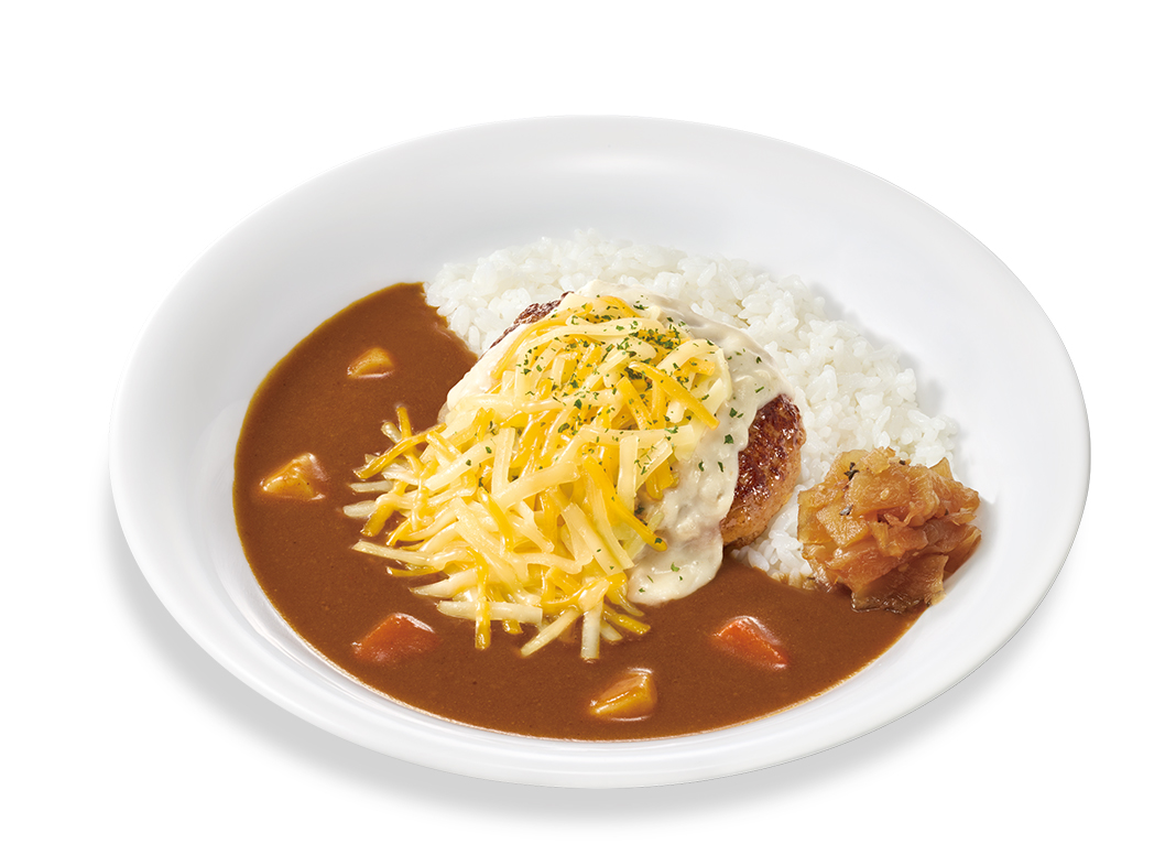 モッツァレラチーズとレッドチェダーチーズを使ったソースを入れた、肉厚な牛と豚の合い挽き肉のハンバーグを、すき家の「カレー」にのせて、さらにミックスチーズをトッピングした濃厚なコクを味わえる商品です。