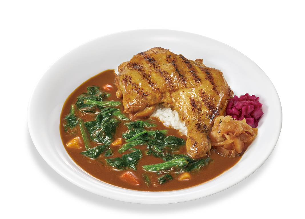 スプーンでほろっとほぐれるほど柔らかい、骨付きの大きな炭火焼きほろほろチキンを豪快にのせた「炭火焼きほろほろチキンカレー」に、彩り豊かなほうれん草をトッピングした商品です。