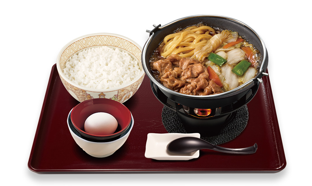 特製の割り下がしみ込んだ柔らかな牛肉や白菜、白滝、うどんなどのたっぷりの具材をご堪能いただける商品です。ご飯を添えて定食にしました。