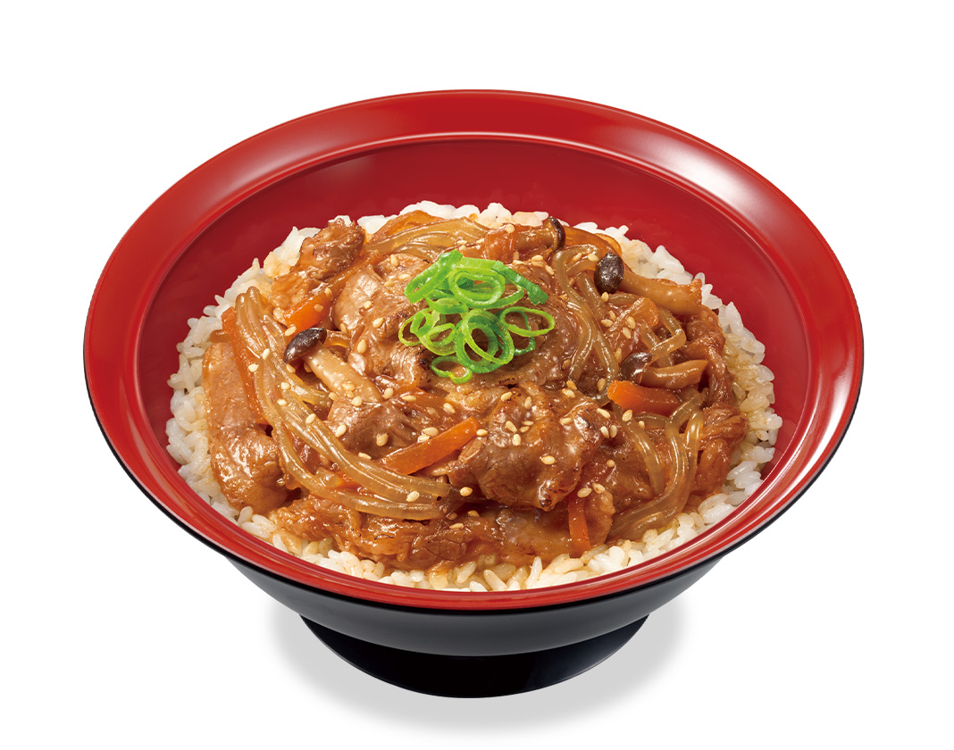 ジューシーな牛カルビやもっちりとしたさつまいも春雨、にんじん、玉ねぎ、しめじをコチュジャンベースのタレで甘辛く仕上げ、ごはんに盛り付けた商品です。