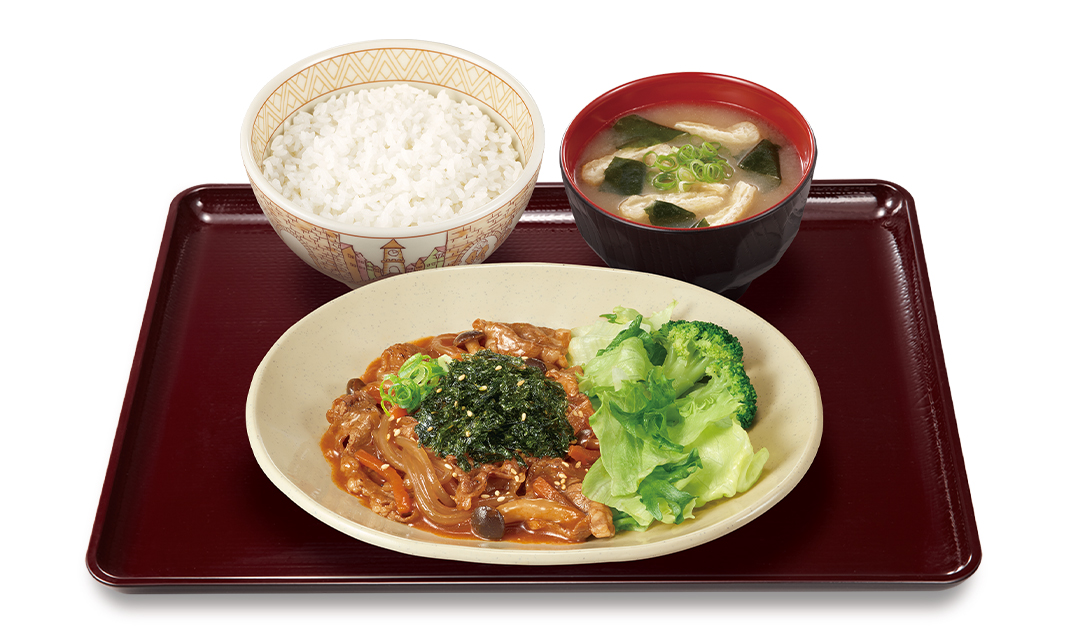 牛カルビにコチュジャンベースの甘辛ダレがしっかりしみ込んださつまいも春雨などの具材を合わせた「プルコギ牛カルビ焼肉皿」にゴマ油の香り豊かな海苔をトッピングした定食です。