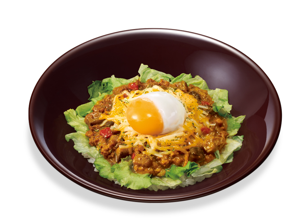鶏と豚の合い挽き肉や大豆ミート、野菜を使った具沢山なキーマカレーとレタス、コクのあるミックスチーズをごはんにのせ、まろやかなおんたまを添えた商品です。