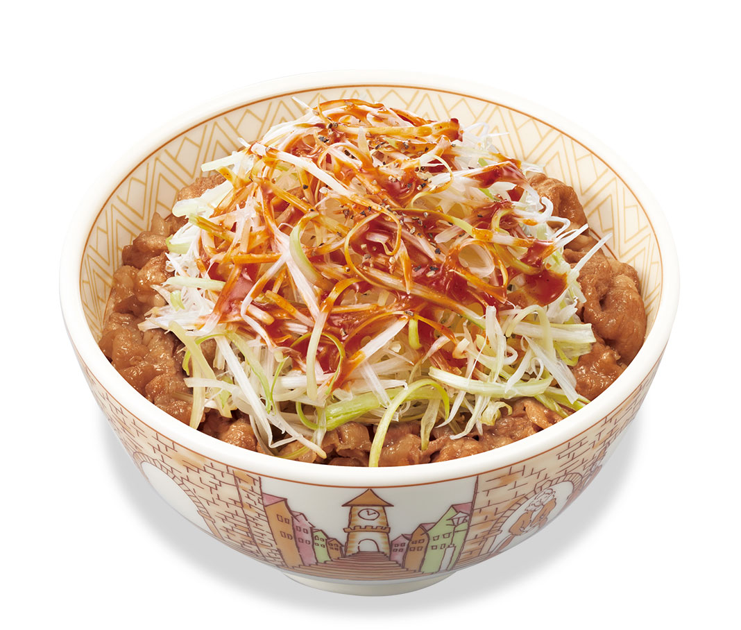 シャキシャキ食感の白髪ねぎをトッピングした牛丼に、唐辛子やコチュジャンが効いた、ピリ辛な味わいがたまらない特製辛旨だれをかけた商品です。