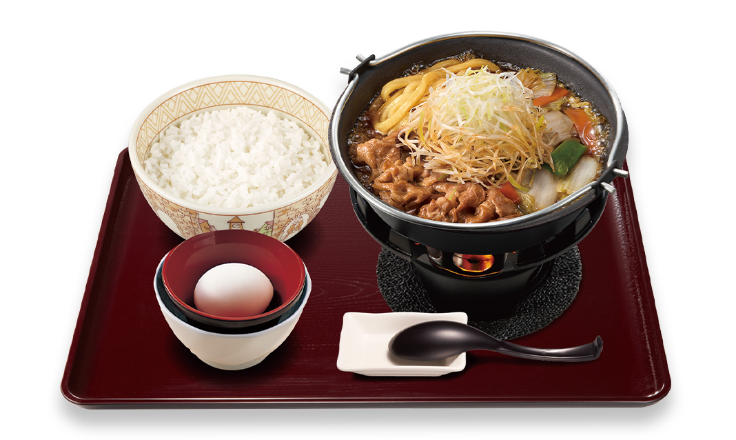 特製の割り下がしみ込んだ柔らかな牛肉や白菜、白滝、うどんなどのたっぷりの具材をご堪能いただける牛すき鍋に、白髪ねぎをトッピングした商品です。ご飯を添えて定食にしました。