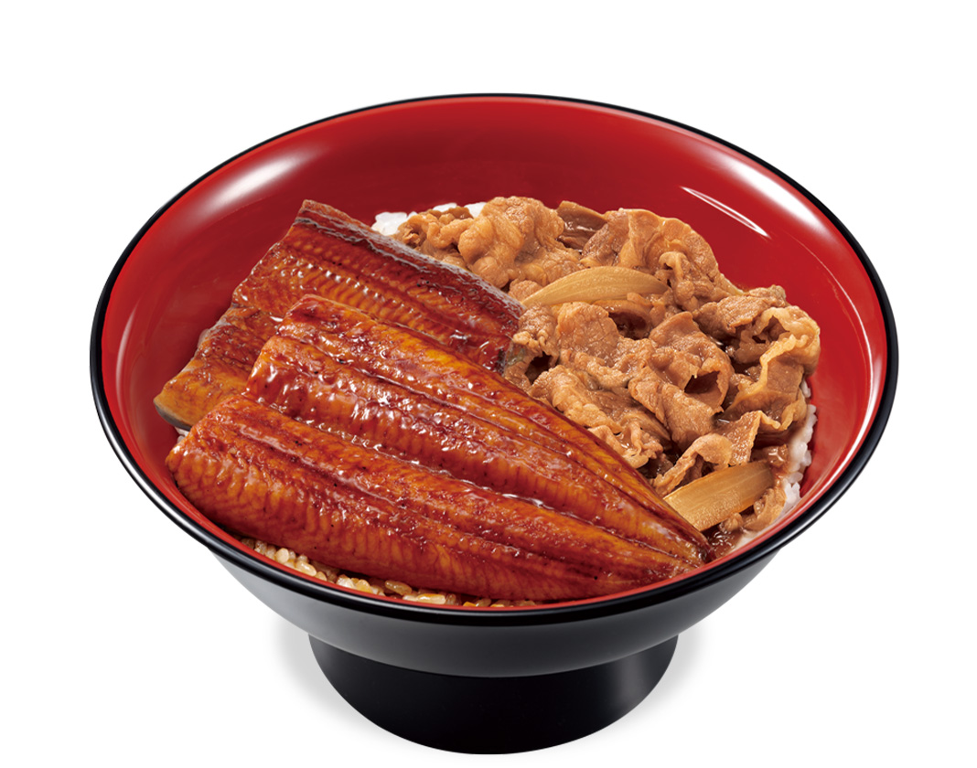秘伝のタレで煮たすき家自慢の牛肉と、香ばしくふっくらとしたうなぎ2枚を、大盛のごはんの上にのせた商品です。