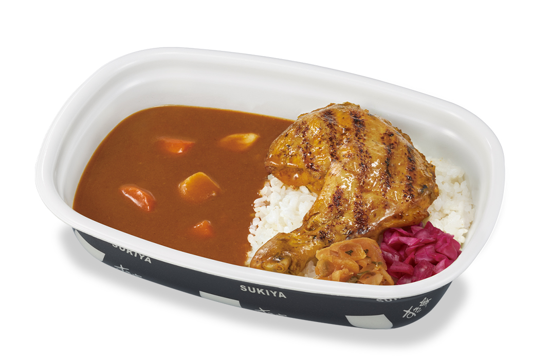 すき家の「カレー」に、スプーンでほろっとほぐれるほど柔らかい骨付きの大きな炭火焼きほろほろチキンを豪快にのせた商品です。別添えの「すき家の特製辛口ソース」をかけて、スパイシーな味わいへの変化をお楽しみください。