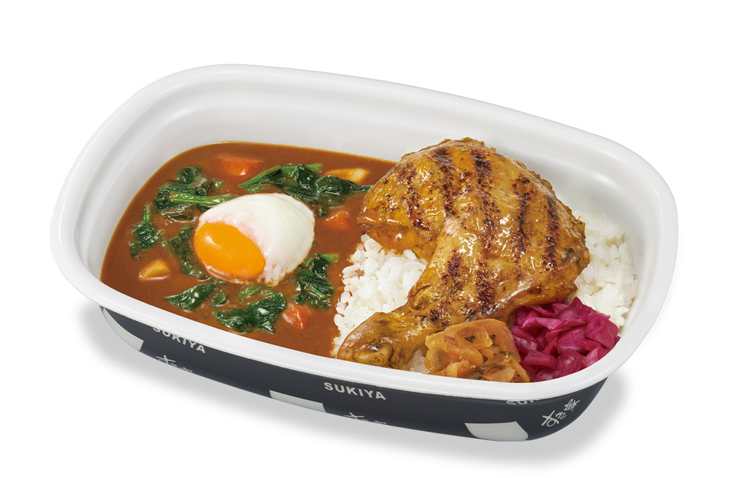 スプーンでほろっとほぐれるほど柔らかい、骨付きの大きな炭火焼きほろほろチキンを豪快にのせた「炭火焼きほろほろチキンカレー」に、彩り豊かなほうれん草とまろやかなおんたまをトッピングした商品です。