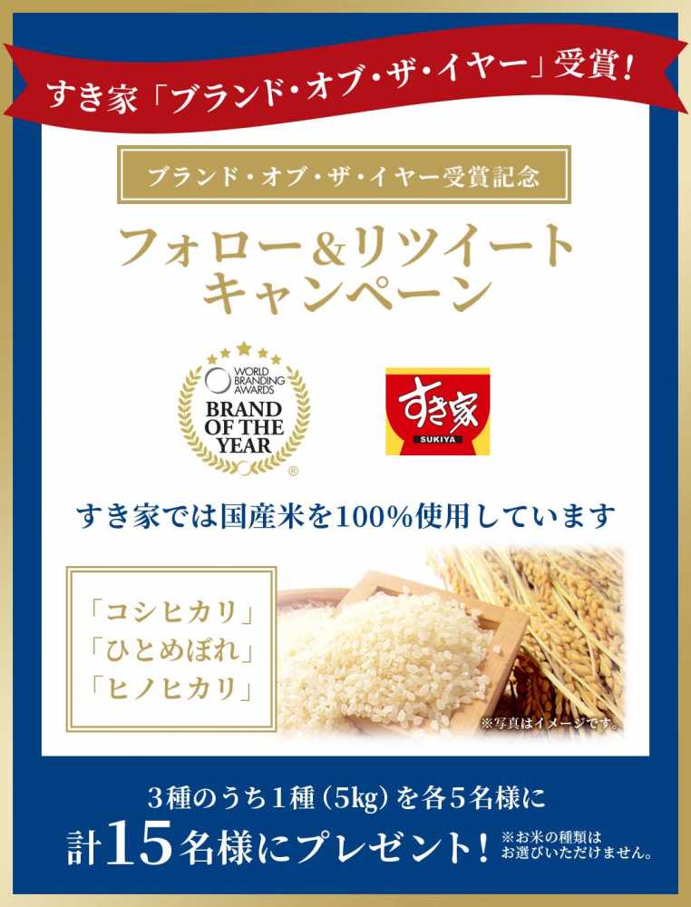 すき家Twitter公式アカウント(@sukiya_jp)をフォローし、対象投稿をリツイートした方の中から抽選で、すき家で使用しているお米「コシヒカリ」「ひとめぼれ」「ヒノヒカリ」(各5kg)が各5名様、計15名様に当たります。